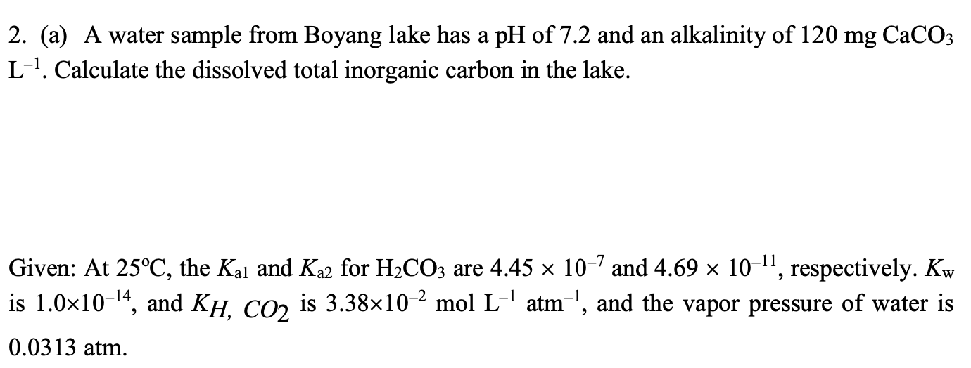 Solved 2. (a) A water sample from Boyang lake has a pH of ...